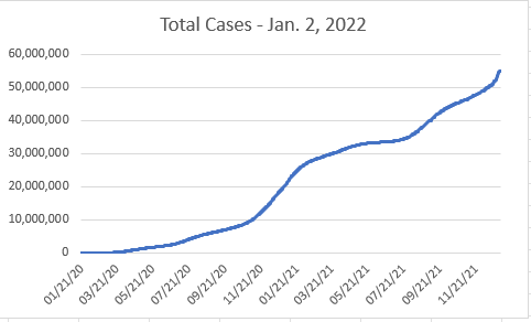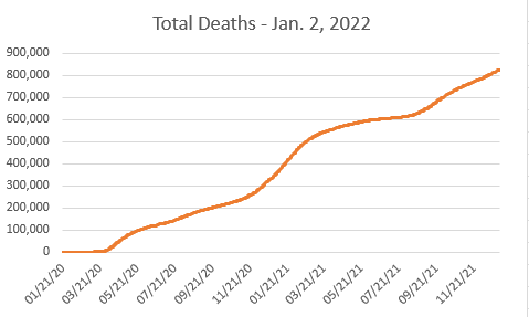 The second graph shows the number of deaths attributed to COVID-19. The number as of January 2, 2022, is about 820,000 people. Typically deaths lag infections by several weeks and we can only hope that Omicron will not be as deadly as earlier variants because if the death rate follows the infection curve, there will be very many additional deaths.