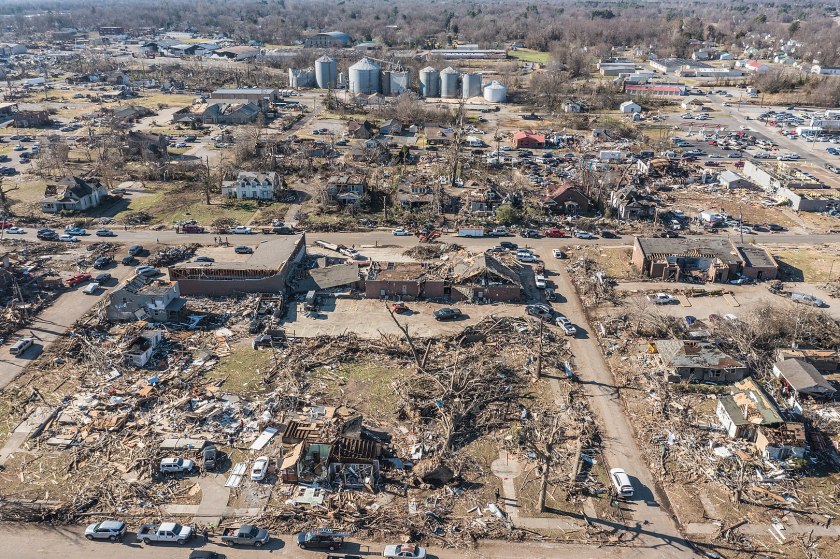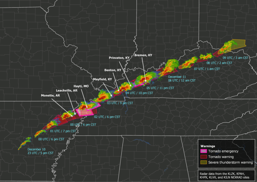 December 2021 was a bad month for tornadoes. One particularly destructive group of tornadoes materialized on December 10, 2021, and made its way across a number of states, but causing most of its destruction in Kentucky. The image above shows the long track that the tornadoes took. To learn more about this series of tornadoes and about tornadoes in general, please consult 2021 Western Kentucky Tornado and Tornadoes in general.